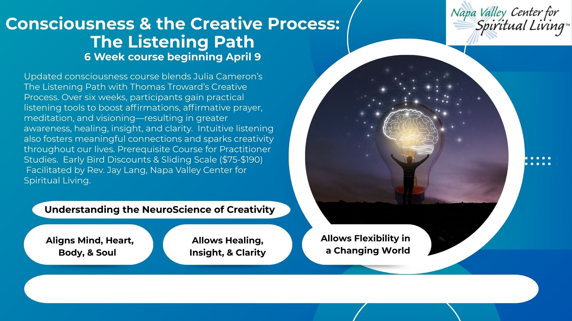 Facilitated by Rev. Jay Lang, Spiritual Director Napa Valley CSL. Dean, School of Spiritual Leadership, Napa Valley: with over 30 years of experience teaching SOMAS, offers innovative and creative hybrid approaches to enhance spirituality and foster deeper connections online.